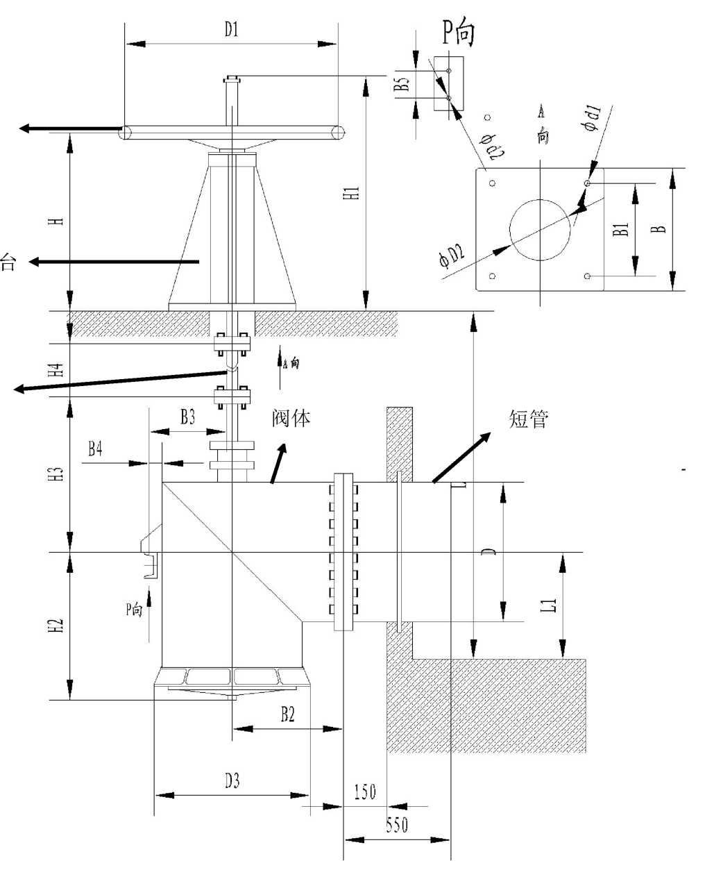 配水闸阀由操作台、连接杆、阀杆、闸阀、短管等组成。